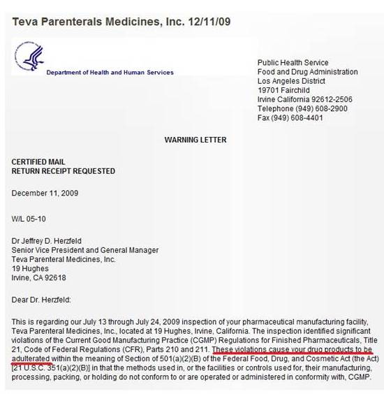 Σα να μην έφταναν αυτά, το 2011 ο FDA εκδίδει και άλλη έκθεση-κόλαφο για την Teva, αφού οι έλεγχοι των αμερικανικών αρχών σε εργοστάσιο της εταιρείας στο Ισραήλ εντόπισαν και πάλι νοθευμένα φάρμακα, αλλά και ακαθαρσίες, μαύρα σωματίδια άγνωστης σύνθεσης, ανεπαρκείς ελέγχους, μη επιστημονικά ορθές μελέτες, ακύρωση ελέγχων με αρνητικά αποτελέσματα και αντικατάστασή τους από άλλα πιο «βολικά»… Η λίστα είναι μεγάλη…