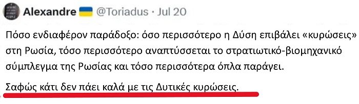 Τούτου λεχθέντος, υπάρχει ένα τελευταίο σημαντικό σημείο που πρέπει να τονιστεί. Πολλοί επισημαίνουν τα «αυξανόμενα οικονομικά προβλήματα» της Ρωσίας ως αντεπιχείρημα ότι η Ρωσία θα μπορούσε να αρχίσει να «χάνει» στο μέλλον, παρά την φαινομενική της κυριαρχία. Είδα μάλιστα ένα δυτικό έντυπο να διαστρέφει την ανακοίνωση του Πούτιν ότι η Ρωσία θα μειώσει τον στρατιωτικό της προϋπολογισμό τον επόμενο χρόνο ως «πράξη απελπισίας», δηλαδή ότι η ρωσική στρατιωτική ικανότητα τελικά «αποδυναμώνεται».