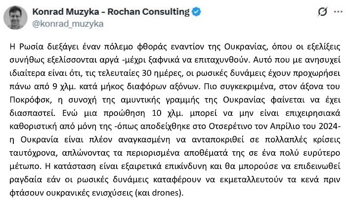 Καταλήγει δηλώνοντας ότι το σωστό ερώτημα δεν είναι πλέον αν η Ουκρανία έχει χάσει —κάτι που είναι ρητορικό σε αυτό το σημείο— αλλά πόσο πολύ θα χάσει: