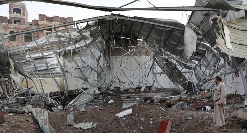 Ένας Υεμενίτης στέκεται στα ερείπια μιας αμερικανικής βομβαρδιστικής επίθεσης, 20 Μαρτίου 2025.